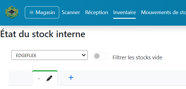 L’inventaire liste toutes les références actuellement en stock interne. La liste est filtrée par entrepôt, sélectionnable en haut de page :